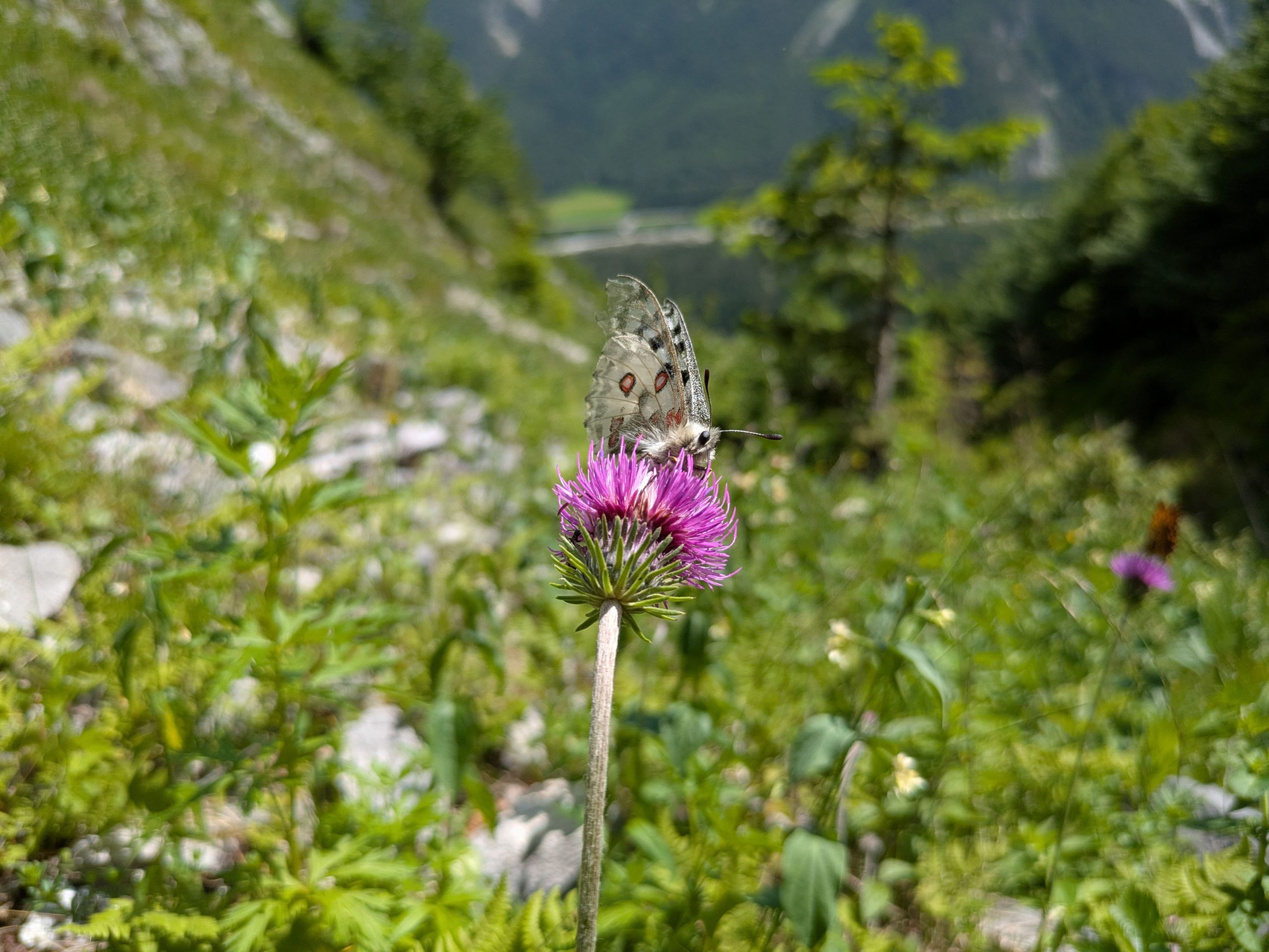 We followed the butterfly to a scree slope and climbed up to about 1,200 m, until the slope was largely free of trees. There we found numerous flowering Alpine Thistles (Carduus defloratus) and Swallow-wort (Vincetoxicum hirundinaria). With the abundance of flowers, the number of butterflies also increased sharply.
